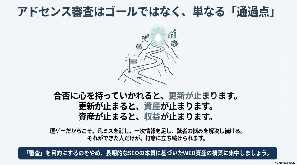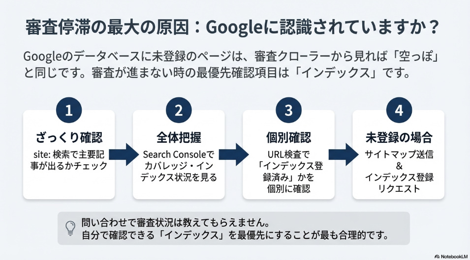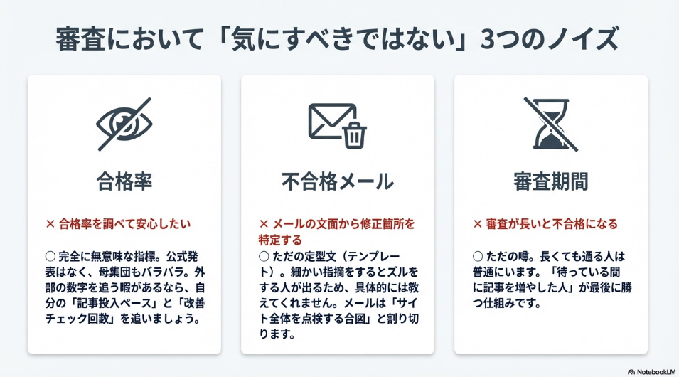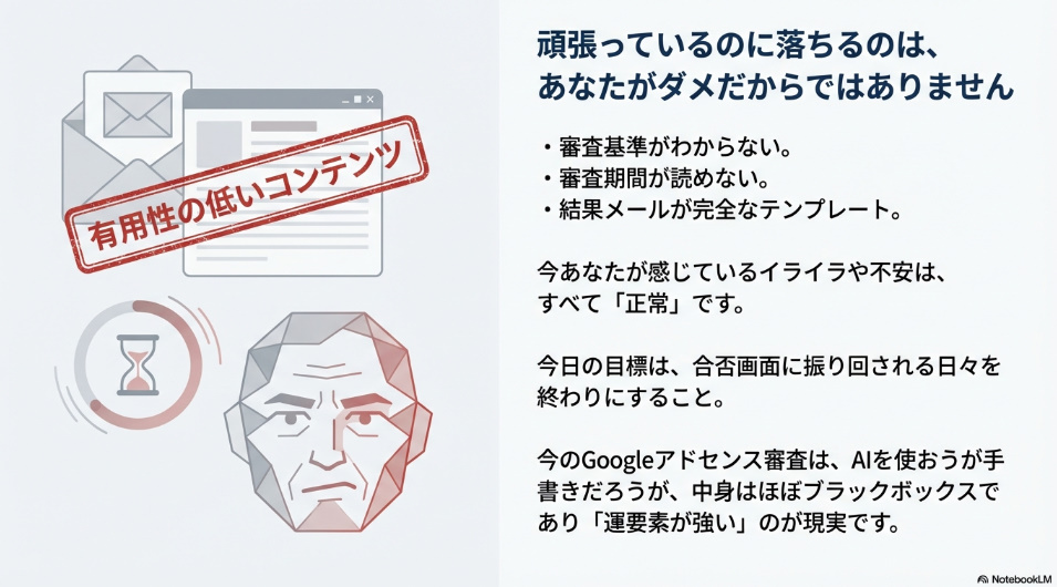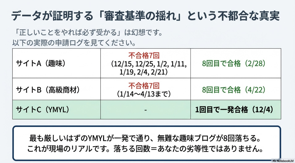 審査はサイトの状態だけじゃなく、タイミングや評価の揺れ、機械判定と目視の混在など、こちらから見えない要素が多い。