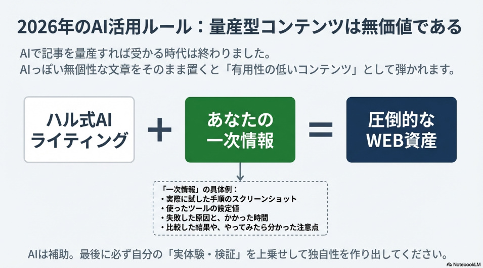 AIを使うなら、必ずあなた自身の経験・検証・失敗談を入れて、独自性を作る。ここをサボると、基準が揺れる以前に「有用性が低い」で落ちる確率が上がります。