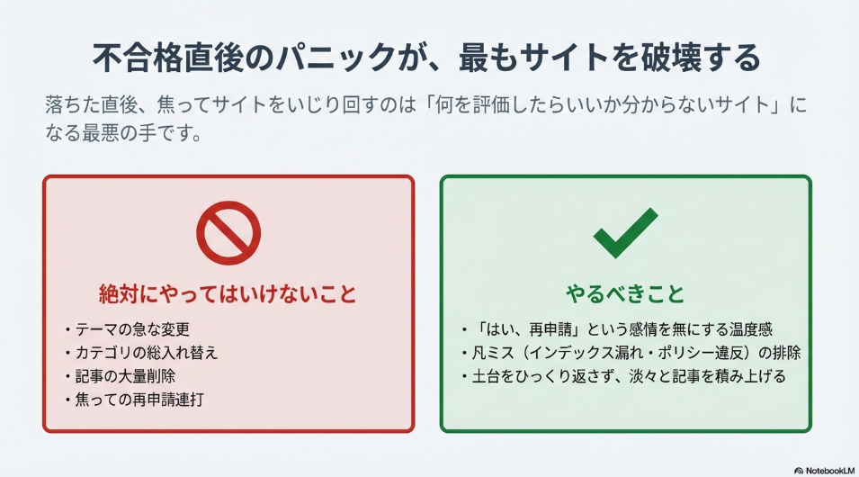 よくある罠:落ちた直後に、焦ってテーマ変更・カテゴリ総入れ替え・記事を大量削除をやることです。