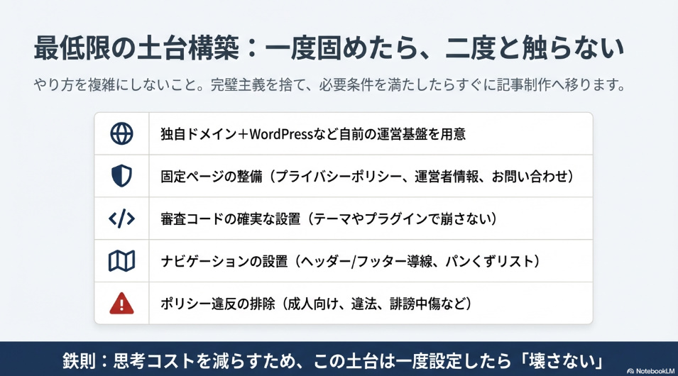 1記事ごとに独自の一次情報、読者が迷わない導線、そしてポリシーに触れない設計。この3つを積み上げると、長期化しても不安が減っていきます。