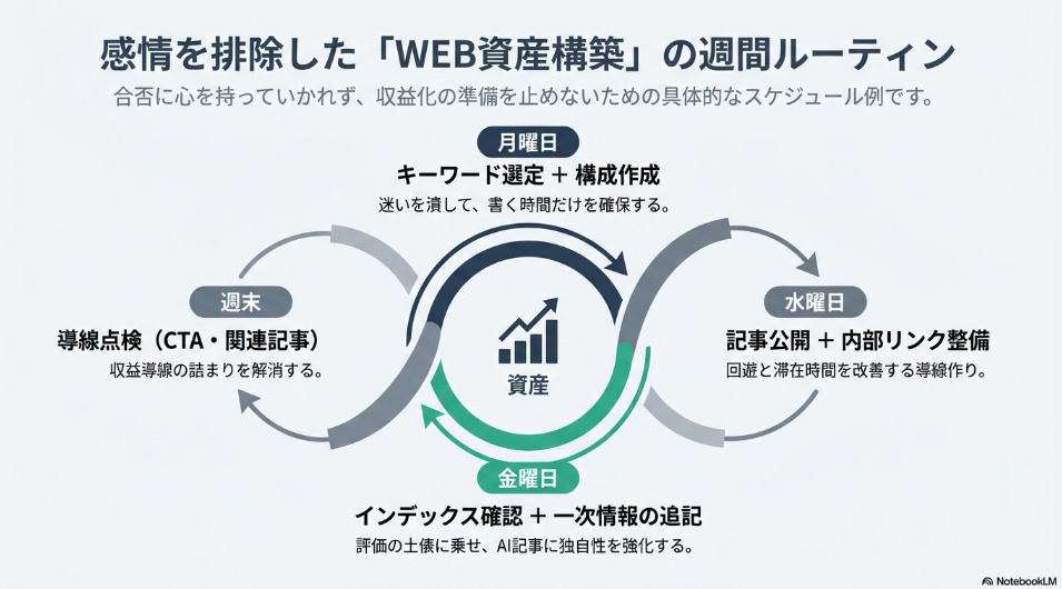 | 週末 | 導線点検(CTA・関連記事) | 収益導線の詰まりを解消 |