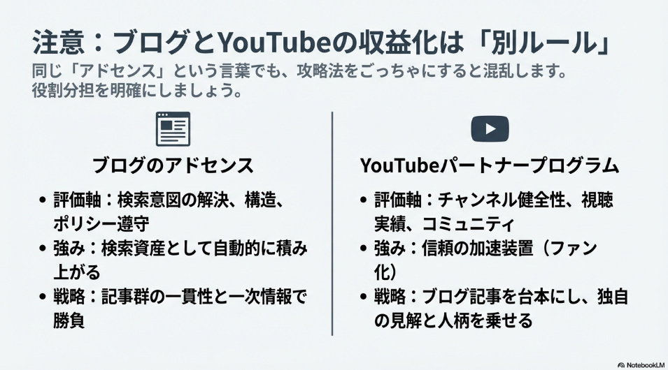 Youtube収益化(YouTubeパートナープログラム)は、ブログのアドセンス審査とは別ルールです。ここをごっちゃにすると混乱します。