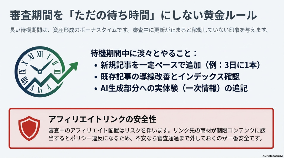 審査中も収益化の準備は進めつつ、AIは補助にして、一次情報を足しながら淡々と記事を入れ続ける。これが一番ストレスが少なくて、論理的です。